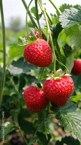 Ripening strawberries hang delicately from lush green plants in a vibrant summer garden