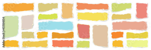 Ripped various colorful paper strips. Realistic crumpled paper scraps with torn edges. Shreds of notebook pages. Vector illustration.