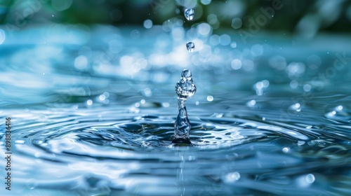 Rippling water droplet creating splashes in a tranquil pond during daylight