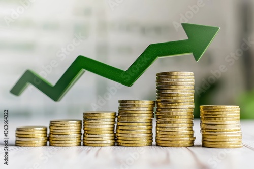 Rising green arrow above increasing stacks of gold coins signals economic growth and prosperity