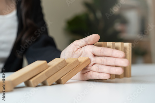Risk management to Protection finance from domino effect concept. Hands stop domino effect before complete fall.