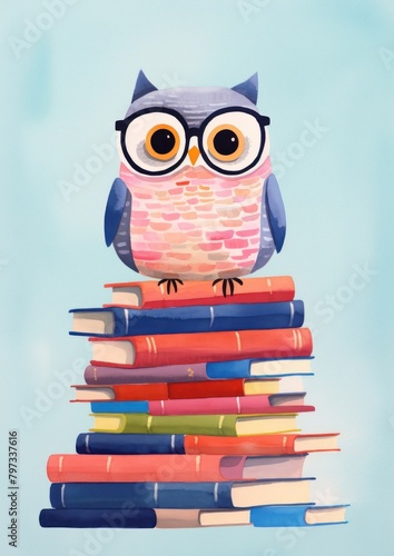 Risograph printing illustration minimal of a cute owl teacher animal book bird.