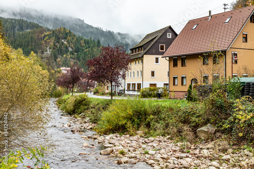 River and houses in a rainy day in Schönmünzach