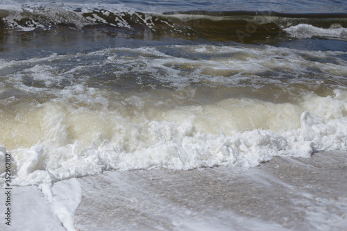River bank, clear water and white thick foam from the surf.
