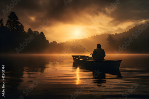 river fishing in boat at dawn, cinematic photography