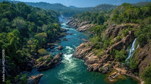 River flowing through lush valley with waterfalls
