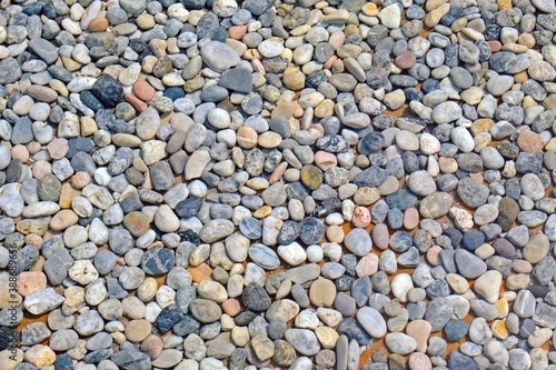 River rock pebble stones under clear water in the pool.