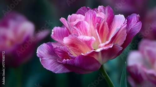 ro photograph of a single vibrant pink tulip flower in full bloom featuring soft focus on the petals and a gently diffused background