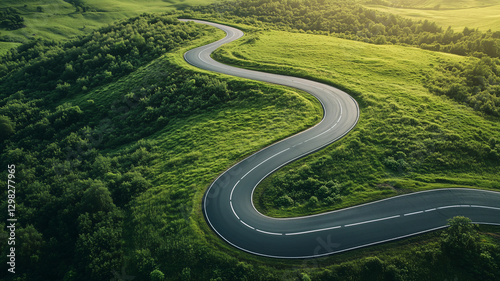 Road, aerial view, green landscape, countryside, summer. Vibrant, bright backdrop, background for project, natural wallpaper. Travel illustration