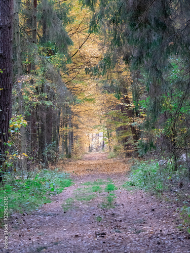 road in woods while spring to autumn transition with beautiful orange and red tones