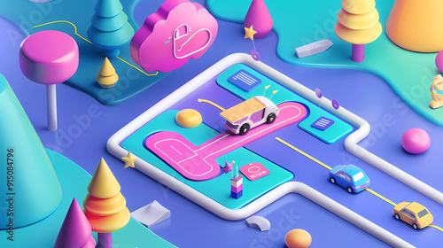 Road infographics. Winding road with 3d signs. Car the path specifies the location on the map 3d render icon cartoon illustration.