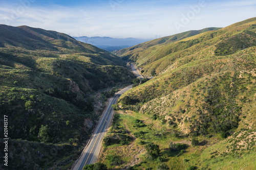 Road leads along the bottom of a canyon in southern California's Los Angeles County.