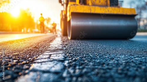 Road roller compressing fresh asphalt during construction at sunset, symbolizing infrastructure and city development