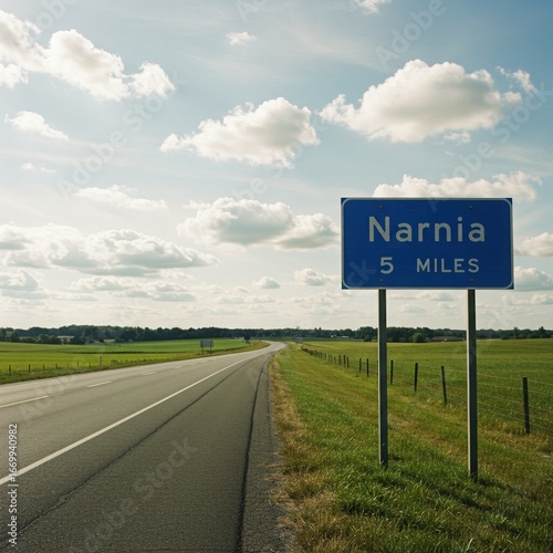 Road Sign to Narnia: 5 Miles Away, Scenic Landscape.