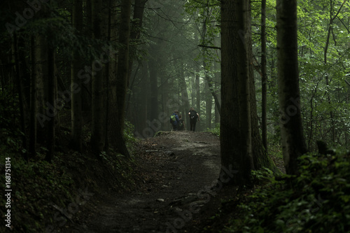 Road through a mysterious dark forest in fog, Foggy Forest Background