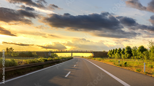 Road to bridge. Sunset highway. Nature and structure