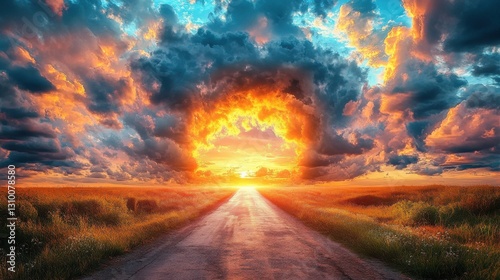 Road to Hope: Fiery Sunset Through Cloudy Skies