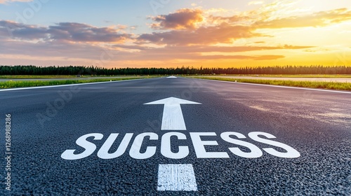 Road to Success Concept with Forward Arrow and Motivational Text on an Open Highway at Sunset
