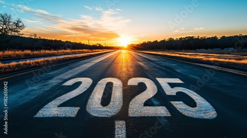 Road to the future: bright sunrise over highway with 2025