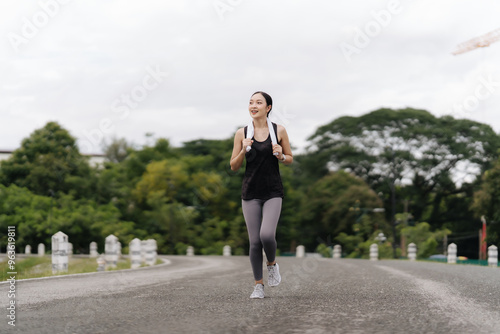 Road to Wellness: Young Asian woman enjoys a refreshing run in the park, embracing a healthy lifestyle amidst nature's embrace.