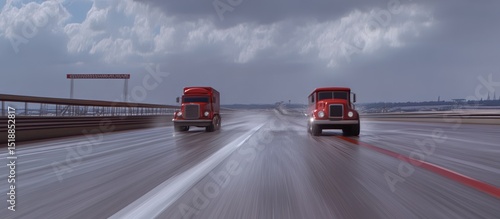 Road transportation showcasing two vintage red trucks speeding on the asphalt