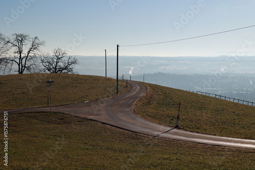 Road with a sign that says "No U-turns" and a telephone pole in the background