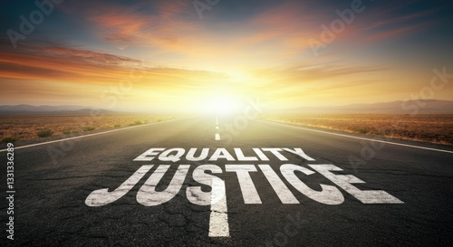 Road with "EQUALITY JUSTICE" written, symbolizing equality and justice at sunrise