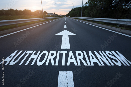 Road with white word 'authoritarianism' and arrow written on it