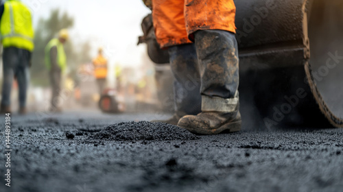 Road workers resurfacing asphalt with steamroller, wearing safety gear