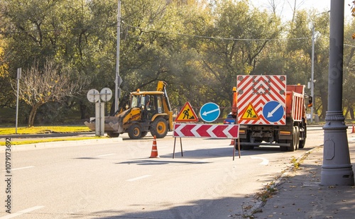 Road works, road signs. Some signs indicating work in progress on a city street. Fences and road signs.