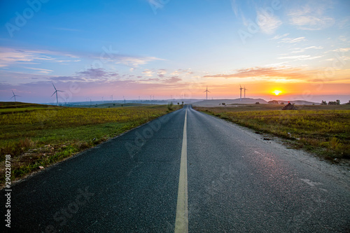 Roads and wind turbines in the evening