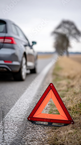 Roadside emergency scene with damaged car and warning triangle for safety awareness