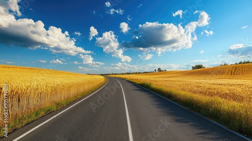 Roadside scenery of a rural road with golden wheat fields and a blue sky