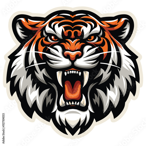 Roaring tiger head illustration in bold colors, fierce and intense, animal logo or mascot design