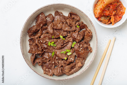 Roasted beef slices Bulgogi, traditional dish of Korea, garnished with sesame seeds and spring onions, served with traditional kimchi on a light table top view