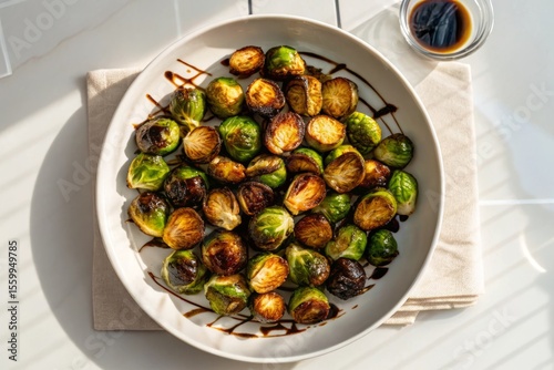 Roasted Brussels Sprouts with Balsamic Glaze, Top View, Afternoon Light, Food Photography