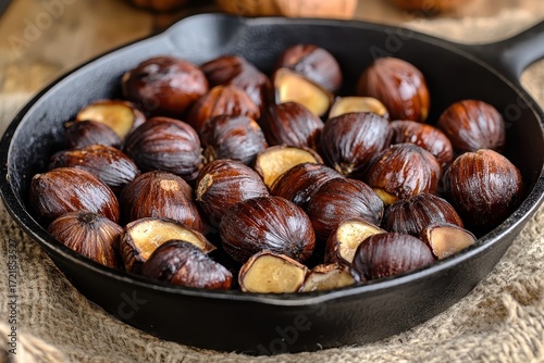 Roasted chestnuts in iron skillet