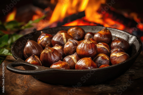 Roasted Chestnuts Served In Traditional Chestnut Pan. Generative AI