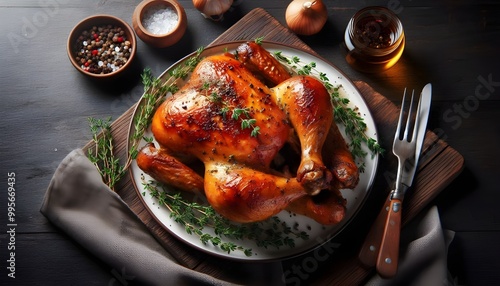 roasted chicken leg quarters with crispy golden brown skin with fresh green thyme leaves on white plate on dark wooden boards, view from above