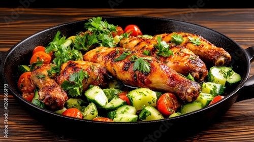 Roasted chicken legs with grilled zucchini and cherry tomatoes in a cast iron skillet on a dark wooden surface. The chicken is golden brown and
