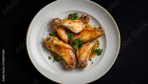 Roasted chicken wings on plate over black stone background. Top view, flat lay