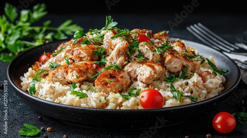 Roasted Chicken with Rice, garnished with parsley and cherry tomatoes. Ready to eat. Suitable for food blog, restaurant menu, or recipe