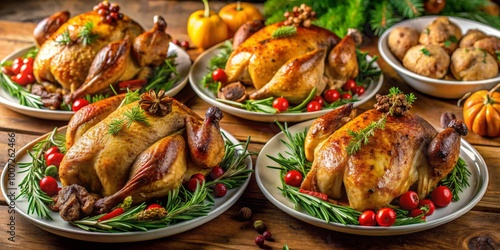 Roasted Chickens with Rosemary and Cranberries on White Plates, Thanksgiving , Festive , Dinner
