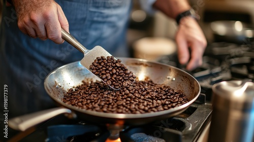 Roasted coffee beans are being added to a pan. This image showcases the process of coffee roasting, ideal for food and beverage businesses.