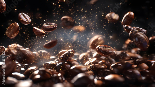 Roasted Coffee Beans Explosion: A dynamic, close-up shot of roasted coffee beans, suspended mid-air with a sense of explosive energy, conveying the aromatic essence of the invigorating beverage.