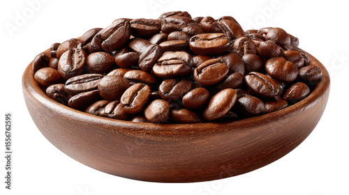 Roasted Coffee Beans in a Wooden Bowl: An overhead perspective showcases rich, roasted coffee beans nestled within a rustic wooden bowl. The dark, glossy beans.