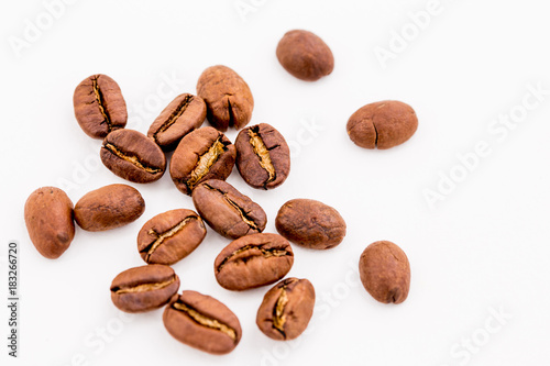 Roasted coffee beans on wood texture background.