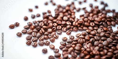 Roasted coffee beans scattered on a white background, showcasing their rich brown color and natural texture.