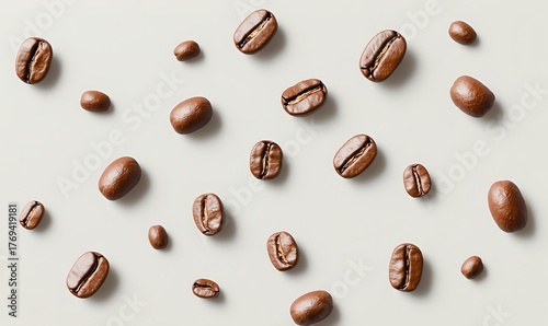 Roasted coffee beans scattered on light beige background, top view. Natural arabica coffee pattern layout for cafe menu, packaging design and food photography.