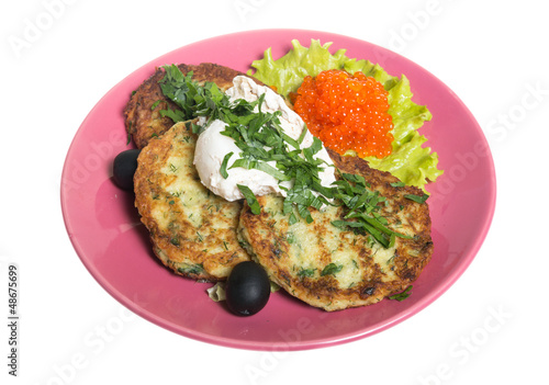 Roasted cutlets of potato with salmon on a plate